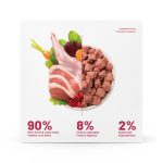 The addition of pork, turkey, and pork liver enriches the recipe with iron, vitamins, and essential amino acids. Cranberries, apple pulp and alfalfa soothe sensitive stomachs, and vegetables such as spinach, carrots and beetroot add fibres and antioxidants.