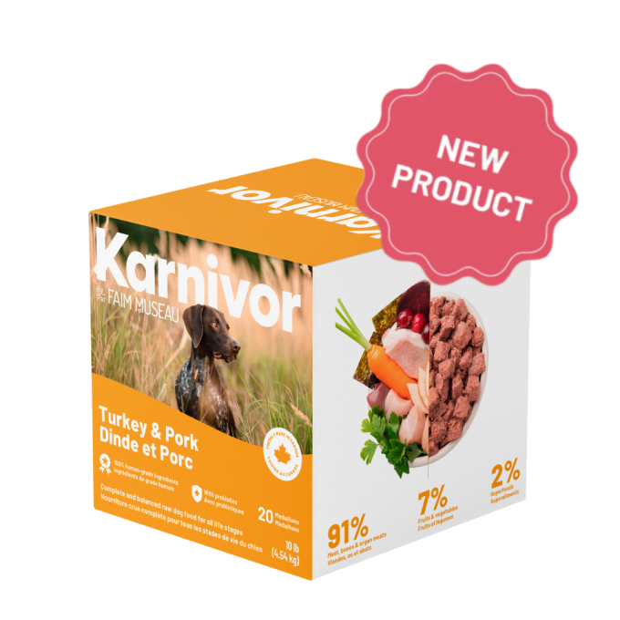 A chicken-free recipe, perfect for sensitive dogs or to add variety to their menu. Turkey and pork form a complete protein duo that supports muscle strength and provides steady energy. Finely ground turkey bones provide the calcium intake needed for healthy teeth and bones, while the pork organ meat provides iron and vitamins.